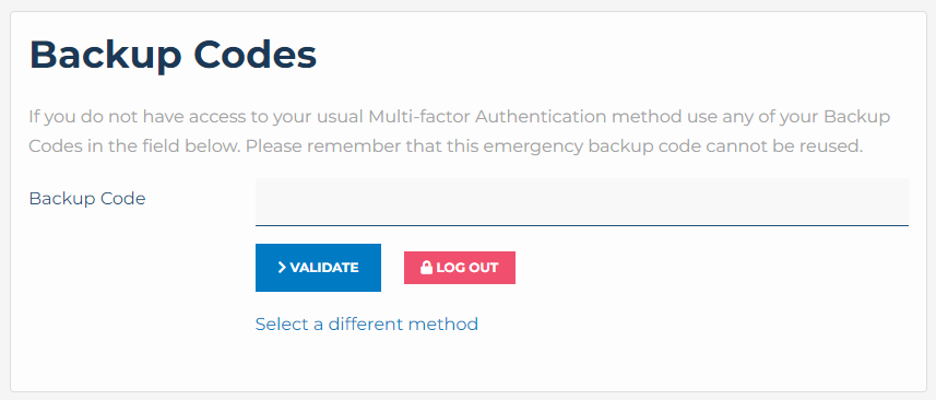 To use a backup code click the link under the Validate button to select a different authentication method, select Backup code.