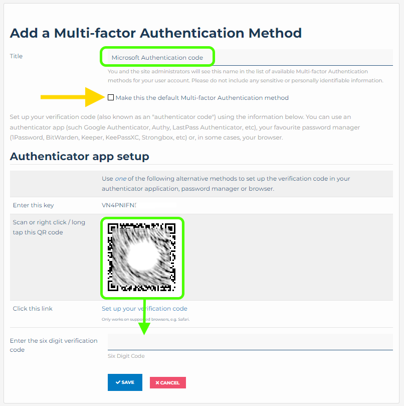- Enter a Title for this MFA method, I’ve named it Microsoft Authentication code so it will be easier to identify when I login.